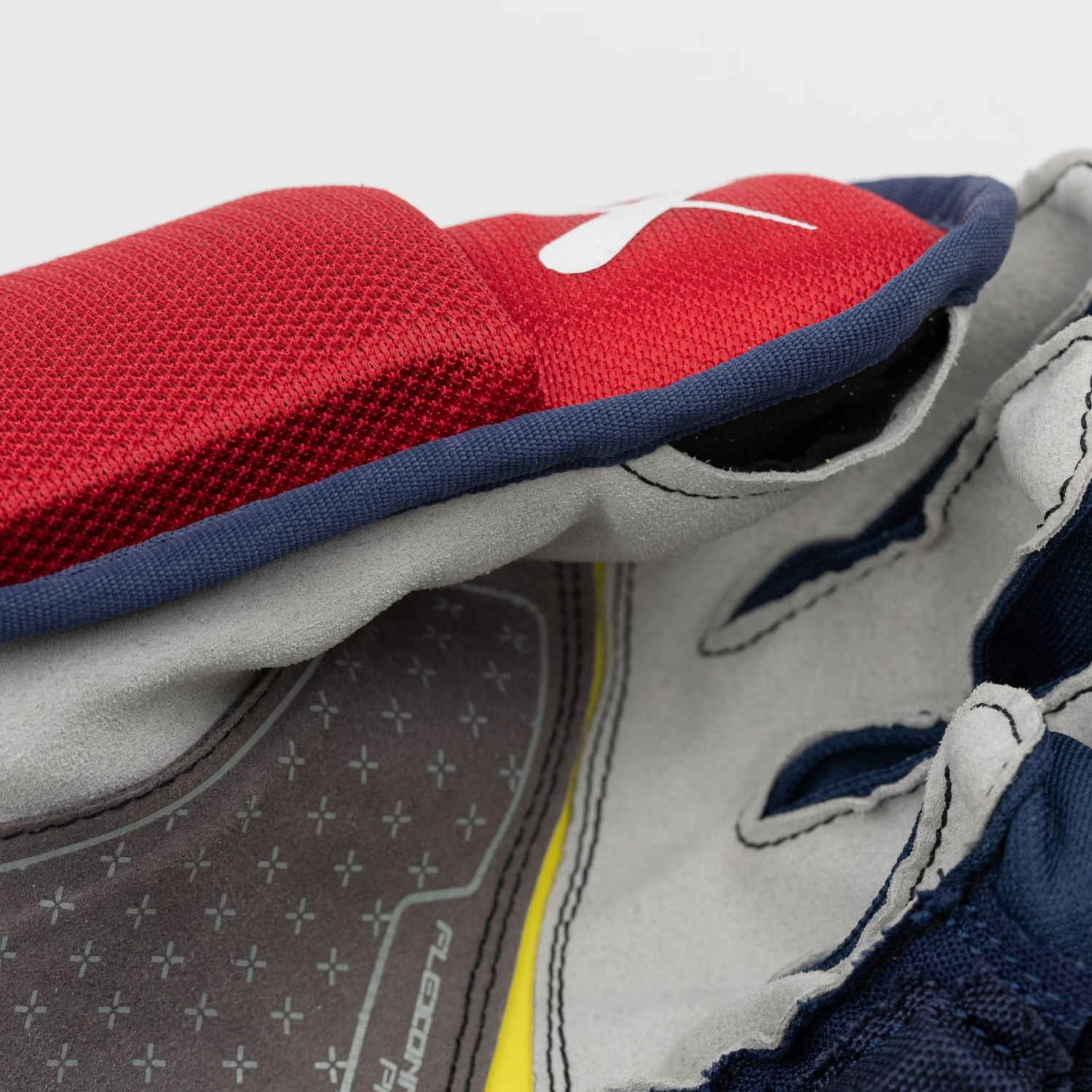This glove uses a Flex-Connekt palm, a palm material previously seen in the Ultrasonic series. This palm design is optimized to provide improved flexibility, and it also allows for better grip and control—enhancing stick handling and puck control on the ice. Additionally, the gloves feature comfort stretch gussets, which ensure increased flexibility and mobility in the hand.