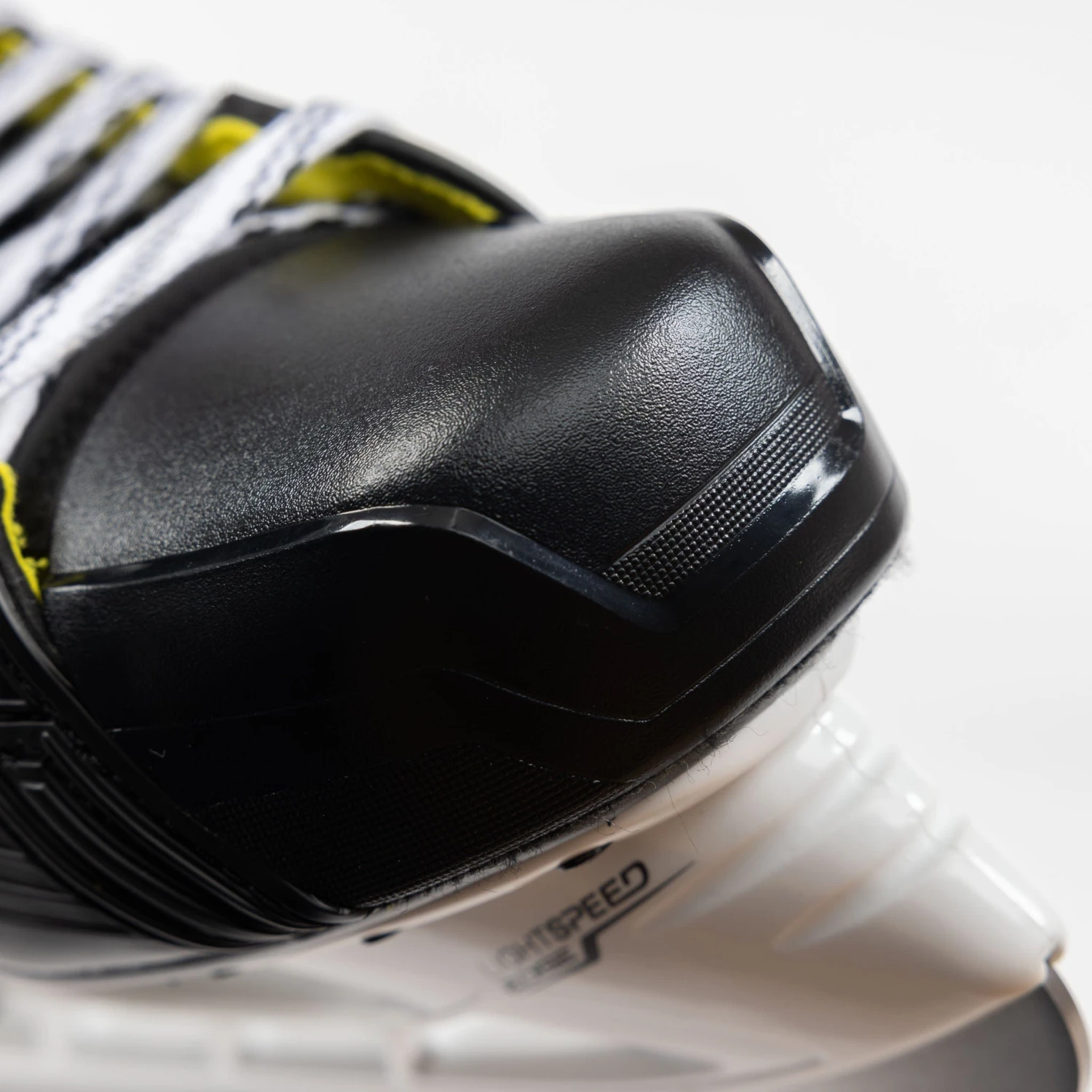 The Supreme line puts a large emphasis on powerful skate stride, which is where the integration of the 3D-Lasted Flex Composite quarter package comes in. The Flex Comp construction keeps that stiffness you need to support your full stride while also keeping the skate lightweight and thermoformable. It’s not so stiff that it makes the skate difficult to break in, however. Bauer has decreased the concentration of reinforcement fibres in the boot, making the skates easier to flex and skate in for developing players.